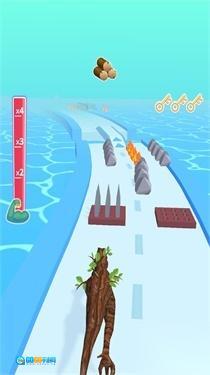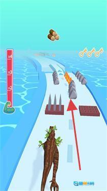 3、操控树根形态的怪兽,按照箭头指示的方向前进,避开水域、尖刺之类的障碍,收集各类道具,全力挑战跑酷的最远距离。