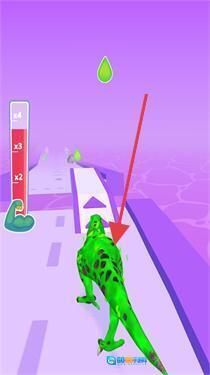 1、控制绿色恐龙沿着跑道向前移动,收集水滴之类的道具,按照箭头指示的方向行动,躲避或穿过障碍物,逐步推进关卡进度。