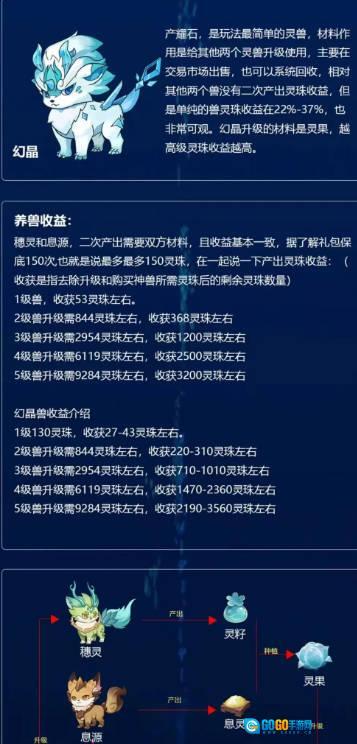 穗灵与息源,二次产出均需双方材料,且收益大致相同。据了解,礼包保底为150次,即最多可获得150灵珠。在此一并说明产出灵珠的收益情况:(收获指扣除升级及购买神兽所需灵珠后的剩余灵珠数量)1级兽的收获约为53灵珠。