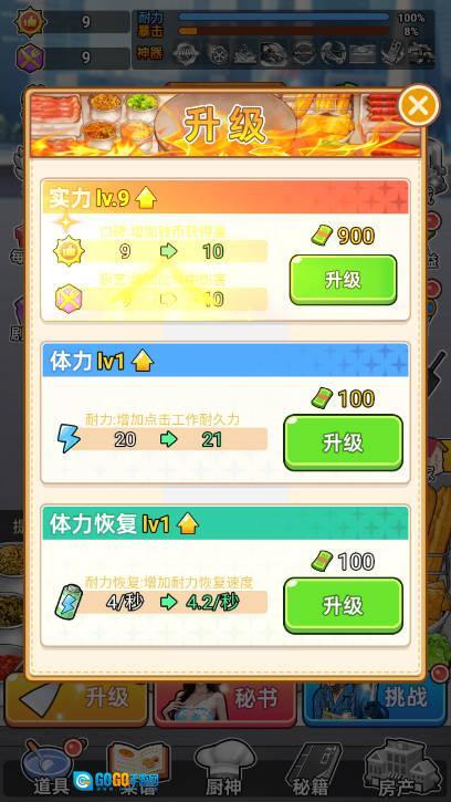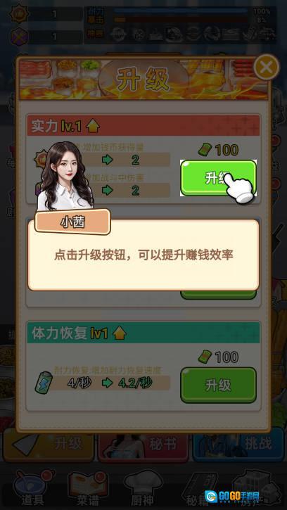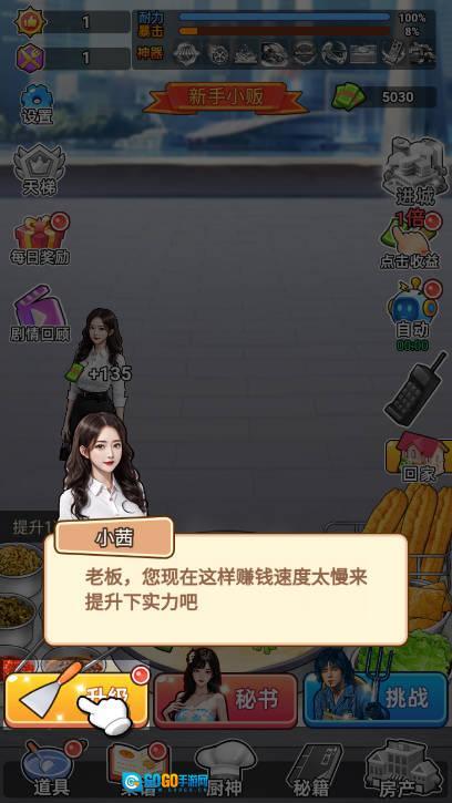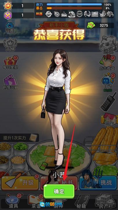 开启点击收益最大化功能后,通过点击摆摊即可赚钱,每次点击时秘书都会跳舞招揽客人(想要解锁全部秘书,需先将实力提升至350级)