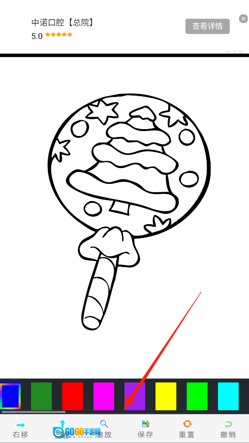 3、给圣诞棒棒糖上色时,可借助底部色块;若要调整细节部位,缩放功能能派上用场;一旦画错,点击撤销按钮就行;在保存作品之前,还能通过重置功能让整体重新来过;而查看详情,则能看到其他用户的配色灵感。