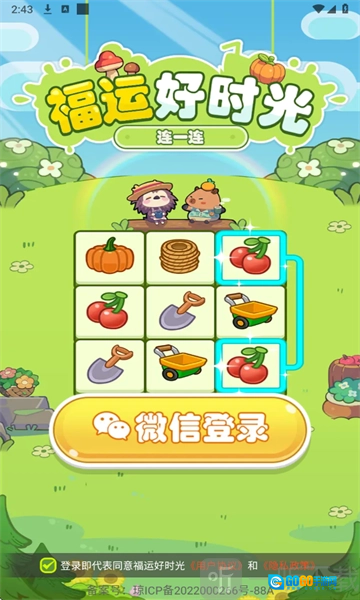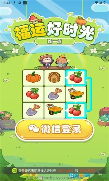 《福运好时光》是一款合成消除类的休闲益智游戏,延续了经典的方块消除玩法——只需点击相连的相同图形组合即可消除方块,循环操作直至清空所有方块,就能通关解锁更多场景与关卡。游戏画面清新明快,以卡通风格的农场为主题,还加入了可爱的小刺猬和水豚作为核心角色,陪伴玩家欢乐互动!