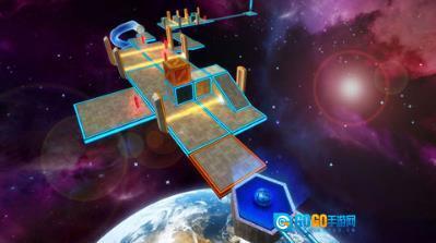 移动到此处,会看到这些泛着蓝光的柱子。前方带蓝色边框的地板是固定不动的,这里也一样,这些柱子都保持静止状态。不过,这类柱子的弹性相当不错。要是不小心撞到它,它会把小球朝着相反方向弹出去。这里的路面比较宽敞,暂时没有太大的危险。但到了后面的关卡,会出现这种柱子与其他陷阱搭配的组合机关,一旦不小心碰到柱子,就很可能被坑惨了——直接弹进陷阱里。
