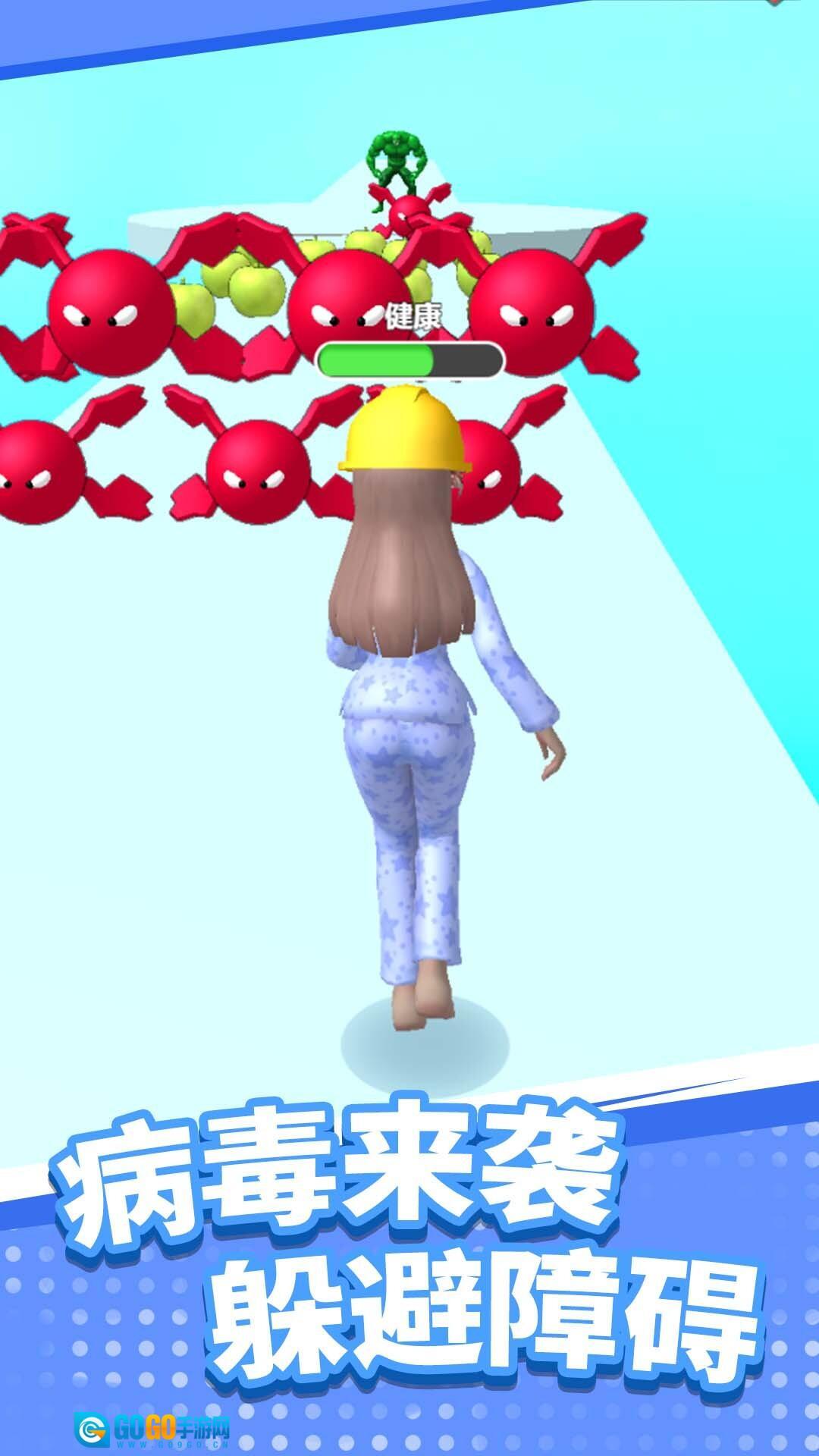 1、玩家可通过左右滑动屏幕来控制角色的移动方向,在赛道上避开病毒、红色障碍等危险元素,同时收集绿色苹果之类的有益物品,以此提高角色的健康状态。