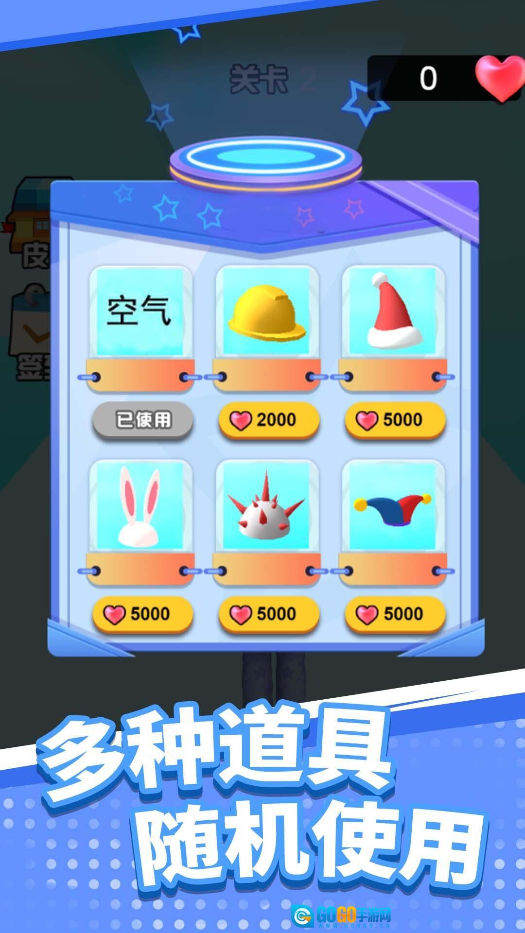2、游戏内设置了多种可随机获取的道具,合理运用这些道具能够帮助玩家顺利闯关;此外,玩家也可以消耗相应资源解锁各式各样的帽子,部分帽子或许还带有特殊效果。