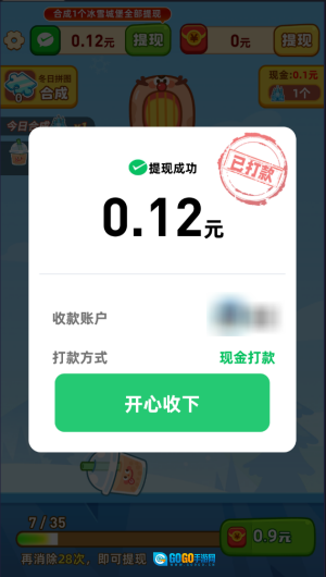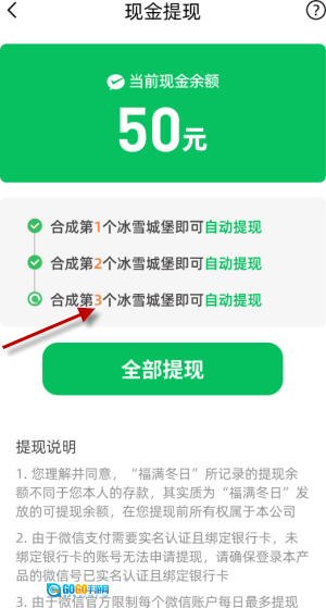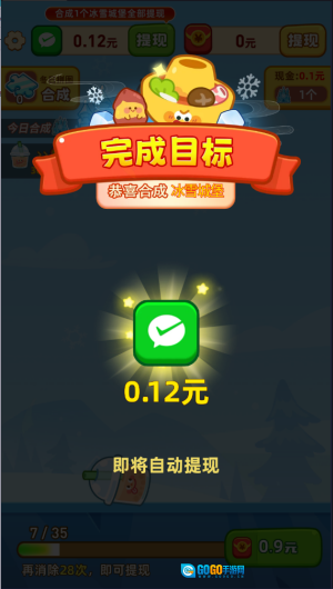 4、每次合成冰雪城堡都能得到一次提现机会,这次我直接提现了0.12。