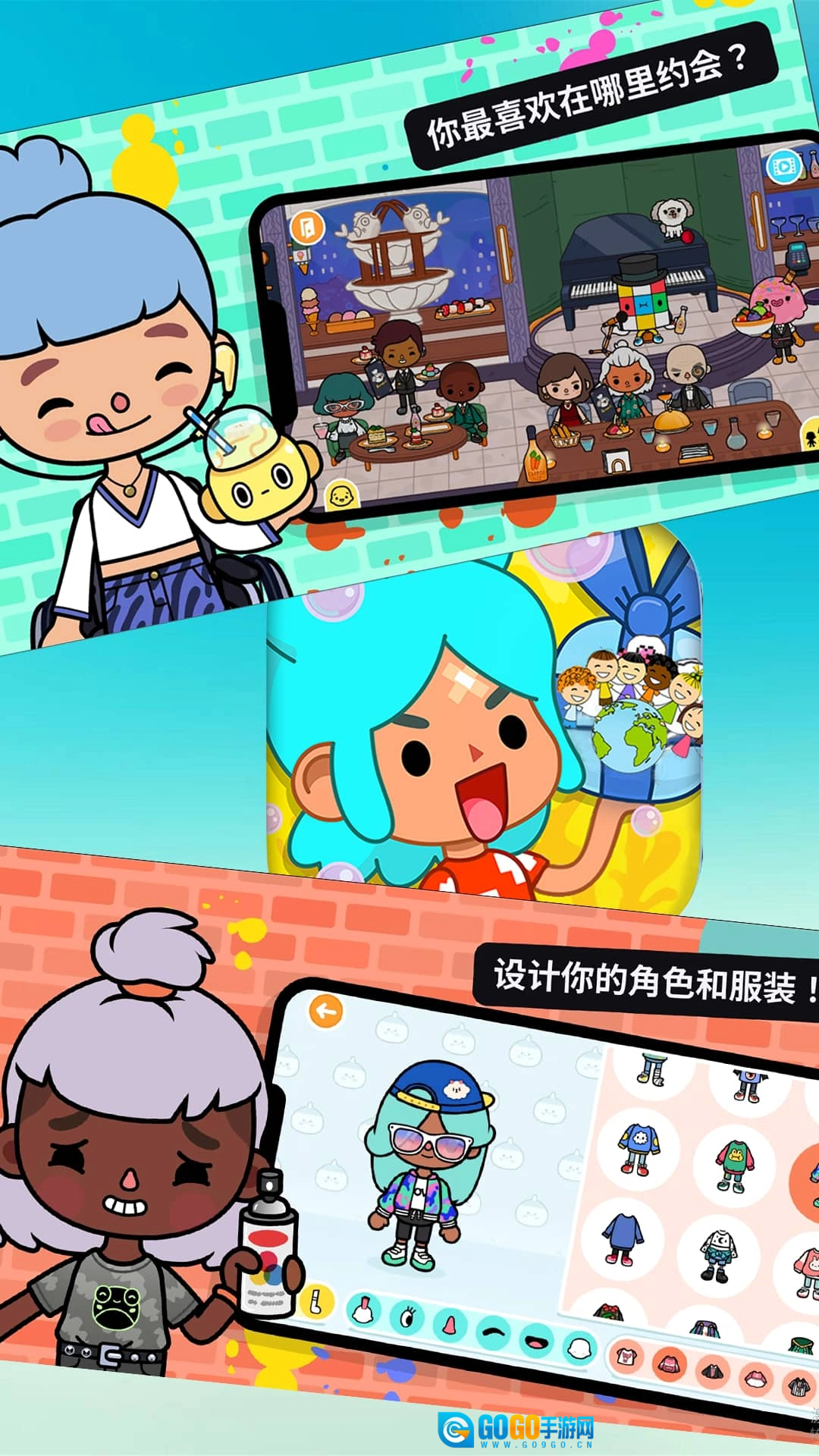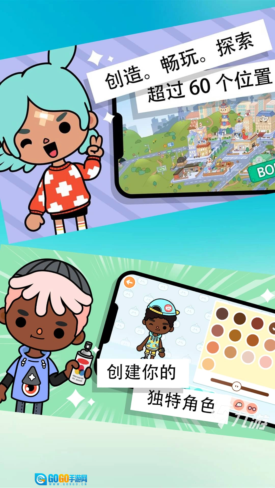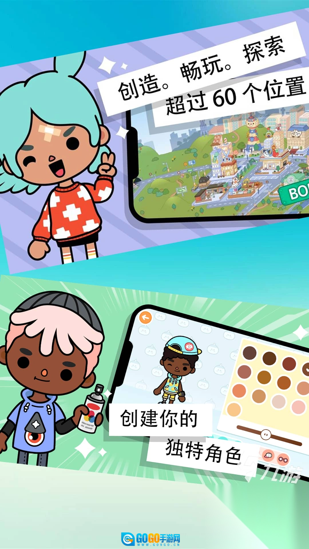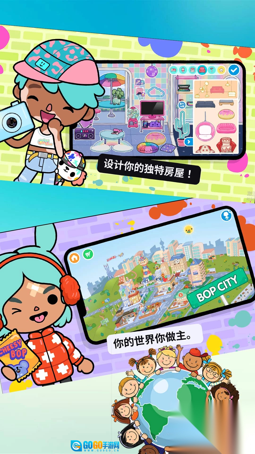 1、设计独具特色的角色,为其搭配服装与妆容,与此同时装饰房屋和场景,构建充满个性的专属世界。
