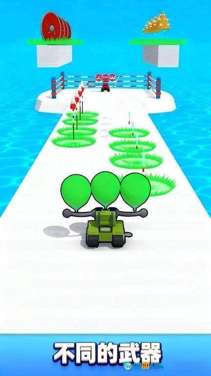 4、各类武器具备独特的攻击模式与范围,需依据战场态势灵活切换,以出其不意的方式击破对手的气球核心。