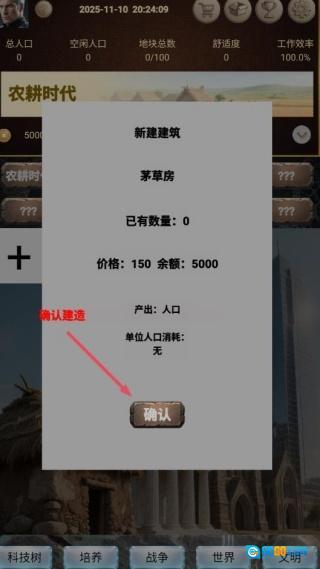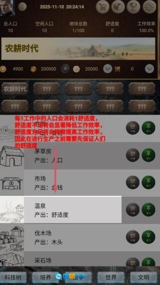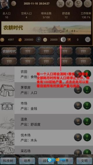 3、优先建造茅草房和农田,把保障人口充足与粮食充裕作为核心任务,防止因资源匮乏而减缓文明发展的进程。