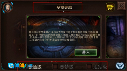 2、接下来是选择关卡的难度级别,分别有普通级、噩梦级和地狱级,我们选择圣堂走廊这个关卡开始挑战。