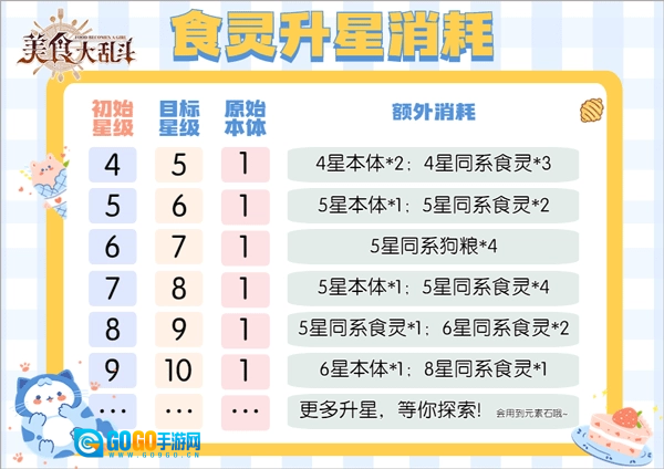相信大家也留意到啦,给食灵们升星是要消耗食灵(也就是狗粮)的!而且不同的升星阶段,需要消耗的食灵种类和数量也不一样呢,依依超贴心地给大家整理了升星表格哦~快夸夸我嘛!