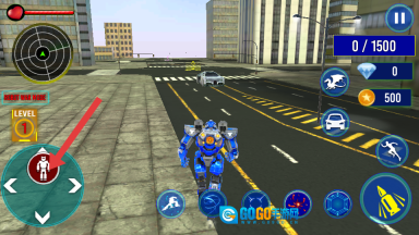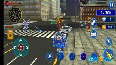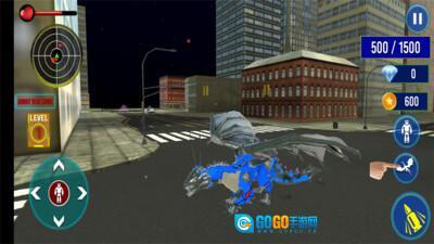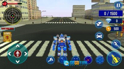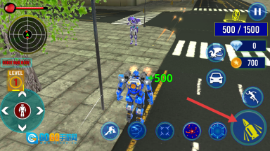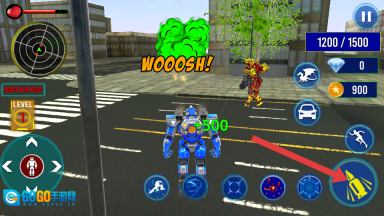 1、游戏开局时,左侧设有虚拟摇杆,可用来操控蓝色机器人的移动方向;右侧则配备了火箭、龙形态、汽车形态等功能按键。