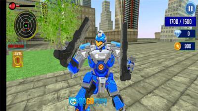 2、了解核心玩法:在现代化的城市街道场景里,操控蓝色机器人和紫色、红色的敌对机器人展开战斗,并且要推动任务进度条的前进。