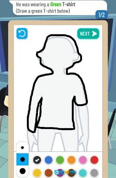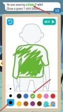 1、按照提示选择绿色,在人物的轮廓上绘制出绿色T恤,完成这一步后点击NEXT按钮,就能进入到下一个绘画任务环节。