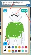 2、挑选黑色,在人物的头部绘制黑色眼镜,绘制完成后点击FINISH,以此结束这一轮的绘画环节。