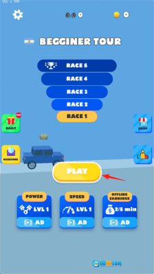 1、点击【PLAY】按钮(红箭头所指位置),进入RACE1关卡,操控蓝色汽车在彩色赛道上跳跃,收集皇冠道具,以此熟悉游戏操作。