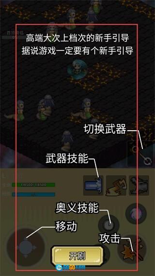 1、在新手引导环节,要先熟悉【移动】和【攻击】按钮的操作,还要掌握【切换武器】的方法以及各类技能的使用,之后点击【开刷】按钮即可开启战斗。