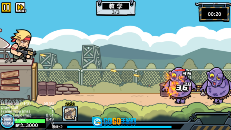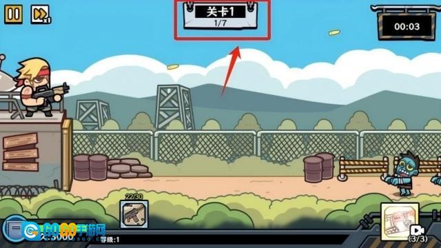 1、进入教学关卡,从等级1开始,操控角色持枪前进,消灭前方的僵尸。