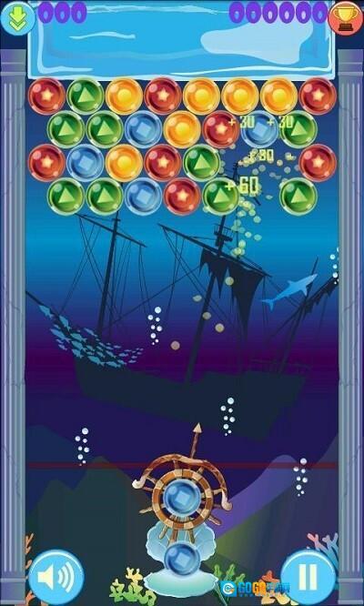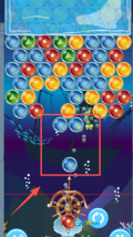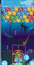2、进入海底射击界面后,你需要操控船舵样式的发射器来瞄准并发射蓝色泡泡,要精准击中相同颜色的泡泡群才能完成消除,另外还要留意躲避场景里的沉船障碍物以及游动的鲨鱼。