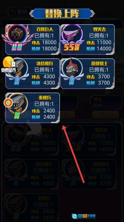 2、打开替换上阵的界面后,选择不同品质的机甲,按照攻防属性来搭配出战的阵容,调整机甲的组合方式,让战斗具备更多策略层面的变化。