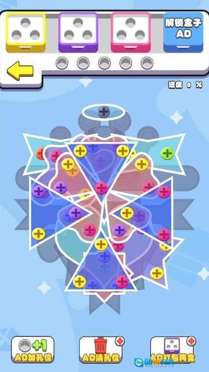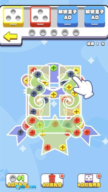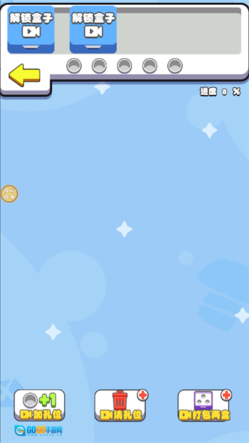5、在玩法页进行【加孔位】【清孔位】【打包两会】的操作,通过观看广告来解锁【盒子】,以此将进度推进至100%。
