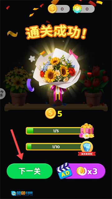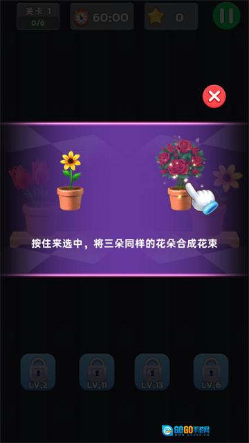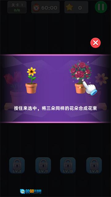 1、进入关卡后,按照提示“按住来选中,将三朵同样的花朵合成花束”的指引,找到三朵相同的花完成合成操作。