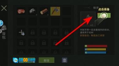 4、最后进行装备物品的操作,在背包里找到已经制作完成的工具,点击“装备”按钮,把工具装配到角色身上,这样就能在之后的探索和生存过程中使用了。