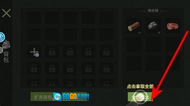 2、接下来进行物资获取,找到物资箱后,点击“全部取出”按钮,把箱子里的木头、石头、肉等各类物资都拿出来,以此丰富自身的资源储备。