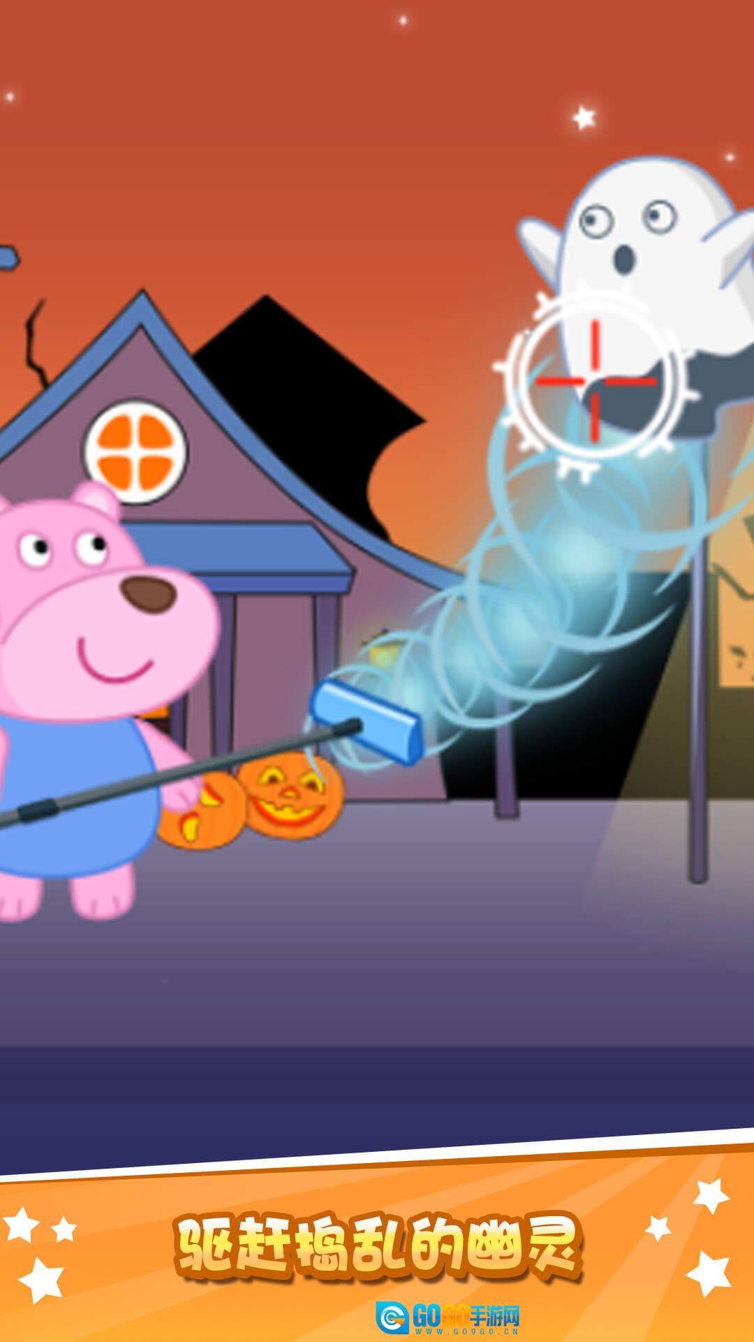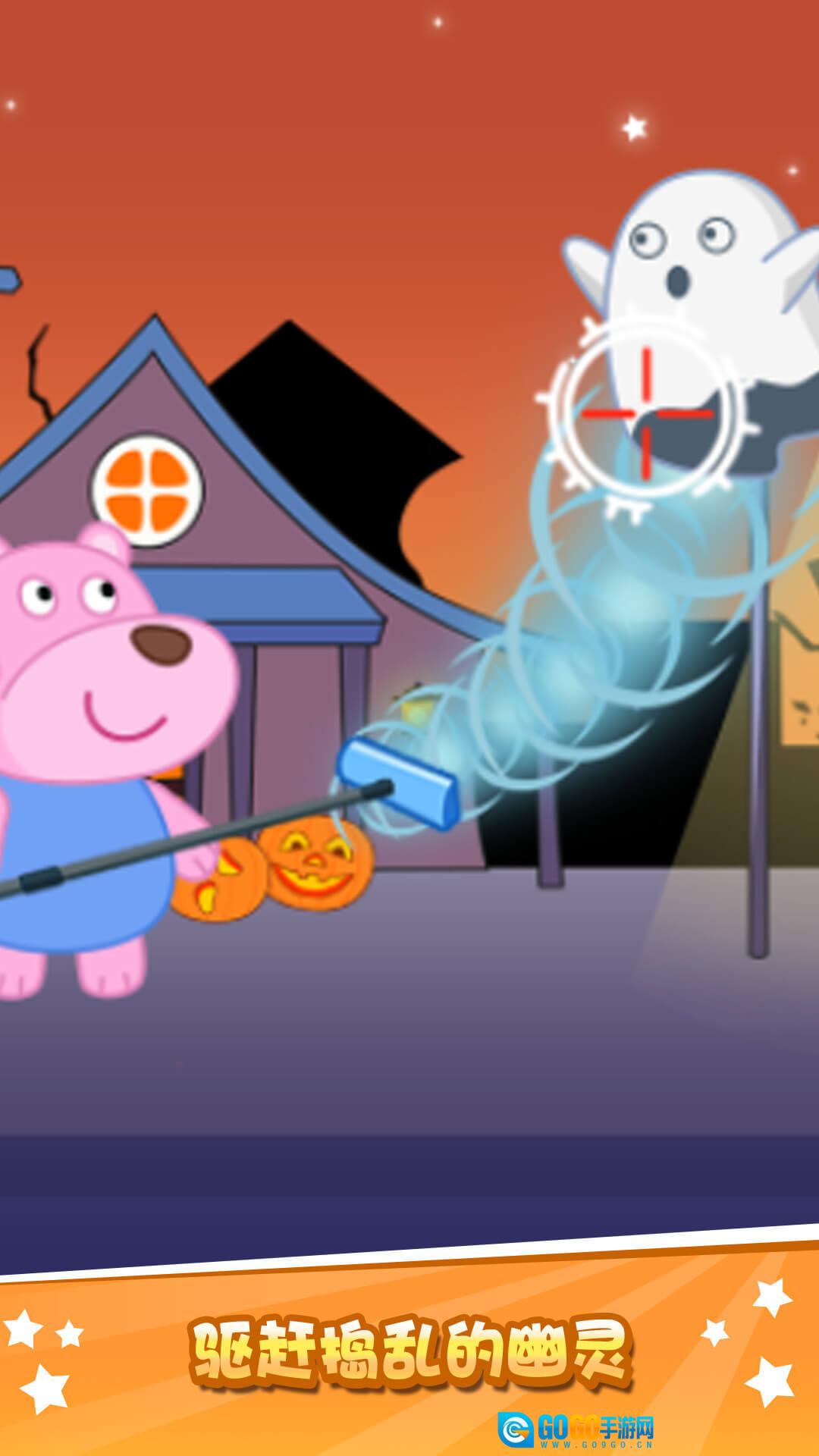 听说新建好的万圣小镇特别有意思,快跟着大熊一家去看看吧!先选一个角色开启万圣小镇的冒险之旅吧!你更喜欢熊姐姐还是熊弟弟呢?按照购物清单先给自己挑一身合适的万圣节装扮吧!哎呀,路上碰到了邪恶的死亡蜗牛,赶紧去消灭它们!有好多搞破坏的幽灵,把他们赶走!前面怎么有南瓜在哭,去问问是怎么回事。万圣小镇的冒险之旅还没结束,还会有什么精彩的故事呢,叫上你的小伙伴们一起来玩吧!