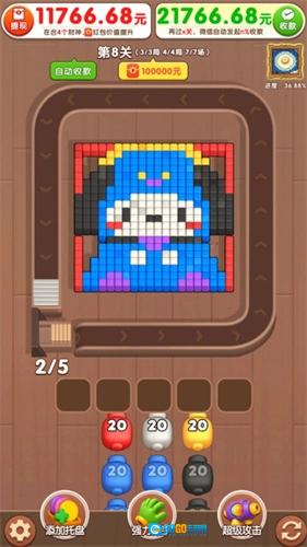 点点砖块的消除玩法相当有意思,玩家只需点击下方的炮台,它就会自动旋转移动,同时消除相同颜色的方块。要是能把关卡里的方块全部顺利消除,就能成功通关,获得的奖励也不会少,而且还有多种道具,随时都能使用。