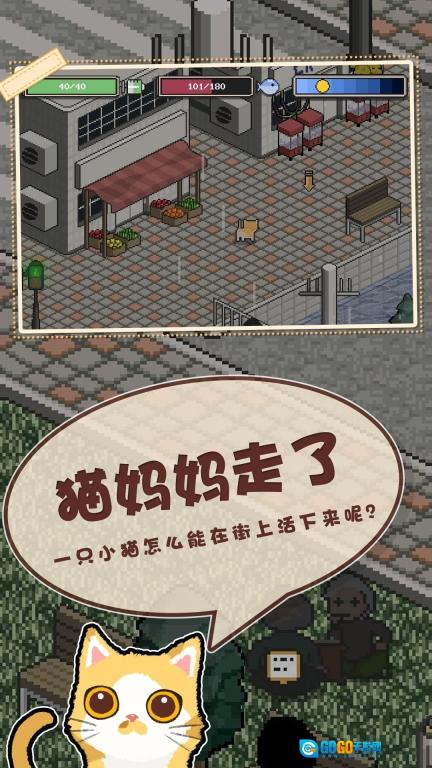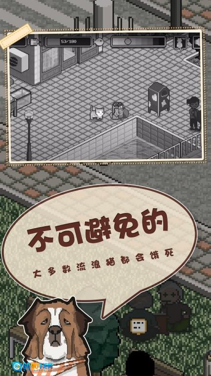 这是一款像素风格的卡通猫养成冒险游戏。游戏开始时,你将扮演一只小小的流浪猫,在街头展开探索与冒险。通过收集更多流浪猫来壮大你的队伍,解锁更多品种的猫咪伙伴,和它们一同探索城市街头,寻找食物和生存物资,开启专属于你的城市冒险之旅。
