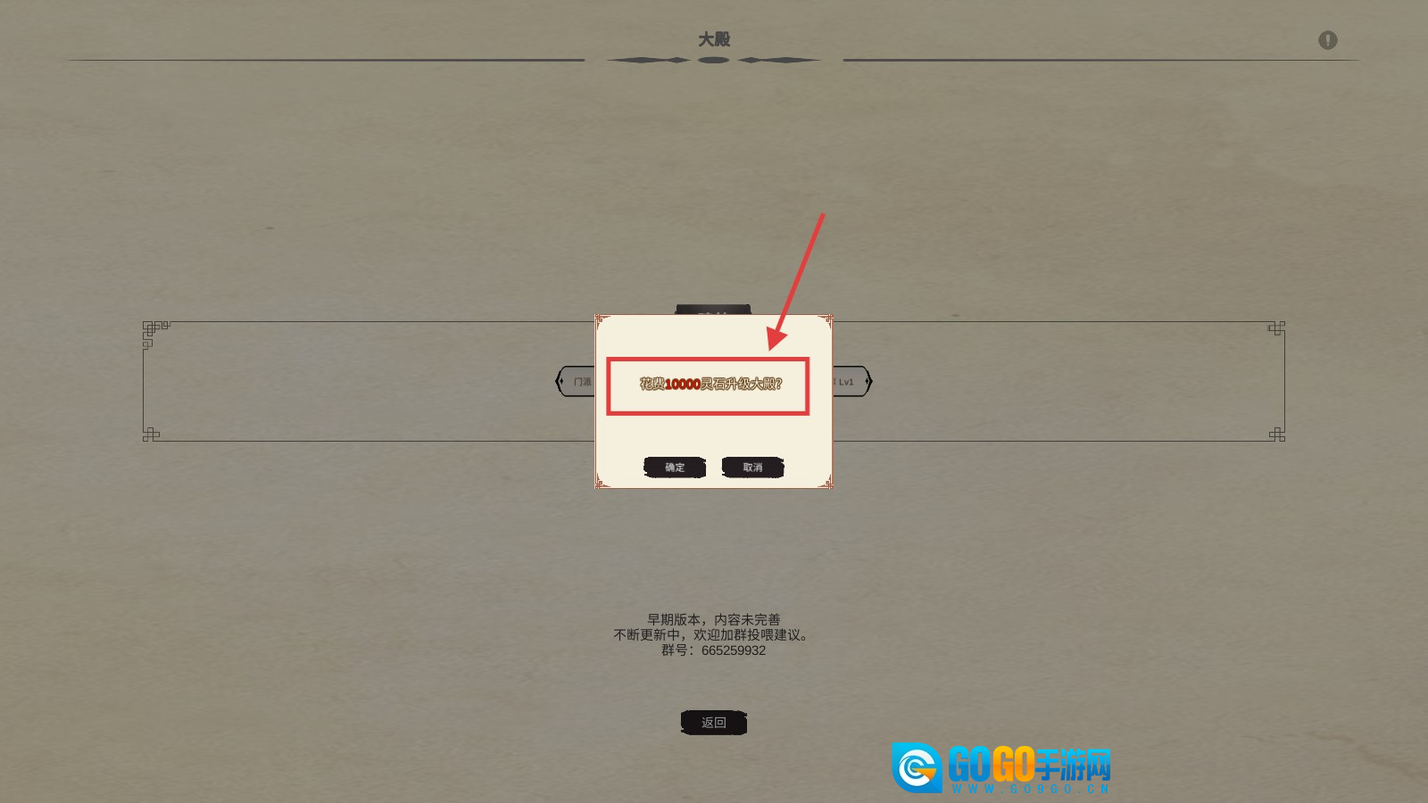 3、当积累到足够的【灵石】后,点击确认按钮来升级【大殿】。提升门派等级不仅能解锁更多的弟子席位,还能开启高级功能,从而进一步增强门派的整体实力。
