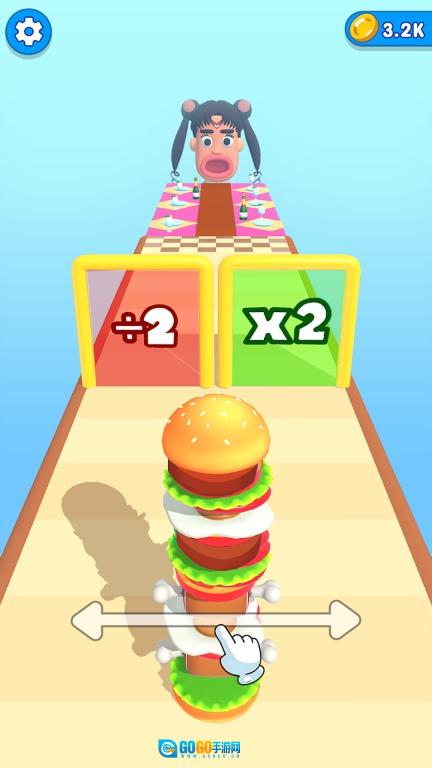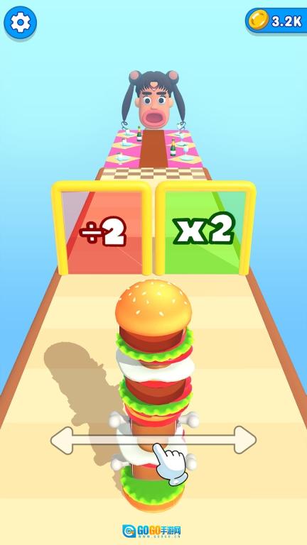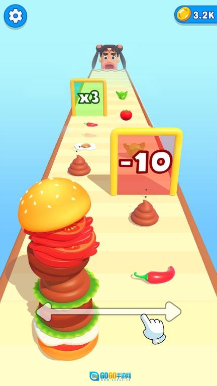 1、从关卡1出发,沿路收集食材并制作汉堡,随后前往终点给客人投喂。