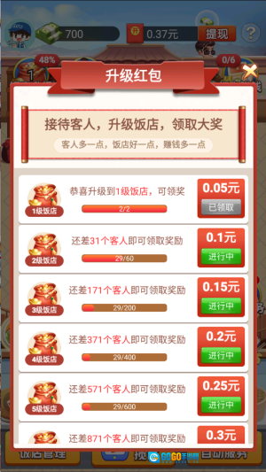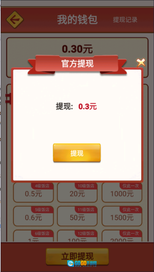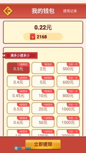 3、每次完成顾客的订单,除了能获得游戏货币外,还能拿到对应的红包;等饭馆等级达到要求后,就可以直接提现啦!