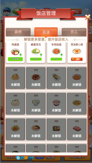 5、在菜谱界面中,玩家既可以通过付费解锁更多菜品,也能够对已有菜品进行升级,从而提高收益。