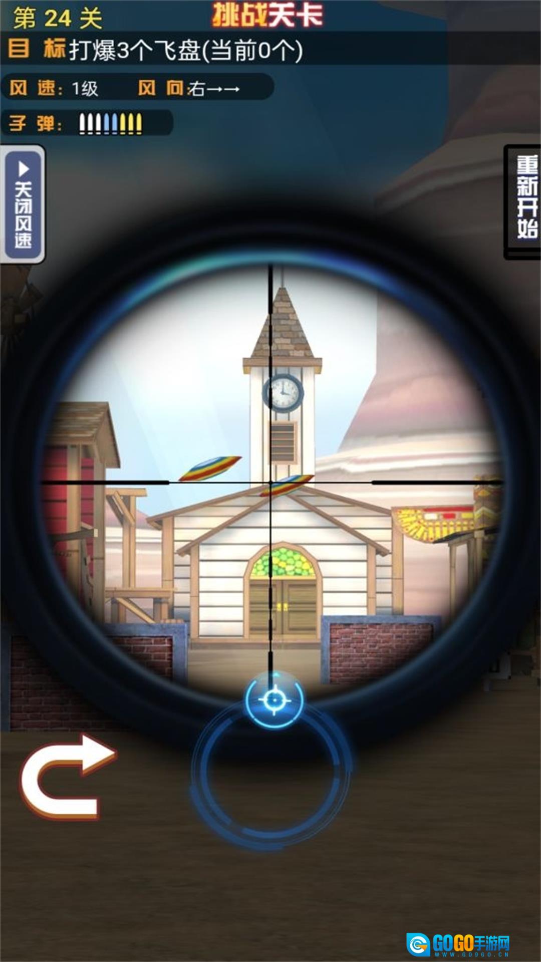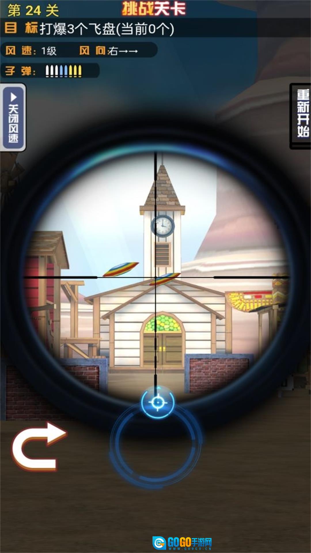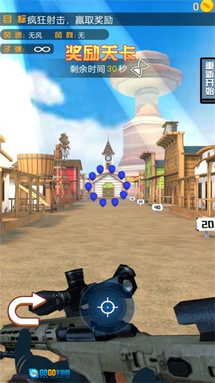 1、借助瞄准镜观测目标,调节焦距以放大目标的细节部分,留意瞄准镜内十字准星和目标的重合情况,迅速击中所有靶子。