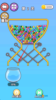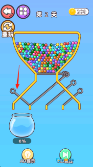 从第2关起,留意彩球容器和插销,按照箭头的提示拔掉相应的插销,使彩球下落。