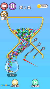 3、最后,顺着箭头的指示拔掉关键插销,让大量彩球流入罐子,就能达成关卡的收集目标。