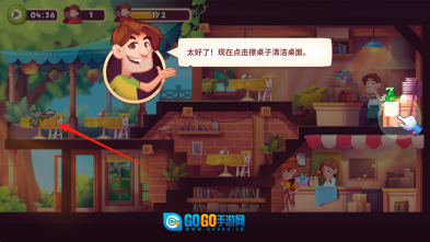 3、顾客起身离座后,按照提示点击箭头所指的桌子,使用抹布进行擦拭清洁,完成桌面的清理工作。