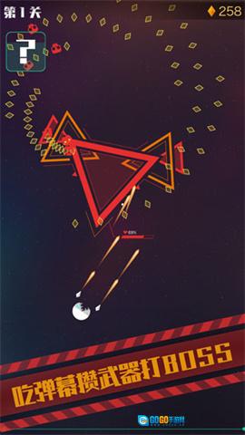 2、通过吸收弹幕来积累能量,当能量值充满后,能够随机获取一种武器或是一段无敌时间。