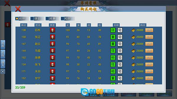 3、购买界面的左上角展示着武将分类,当找到心仪的武将后,点击右侧的【购买】按钮就能完成招募操作。