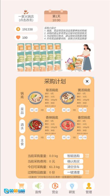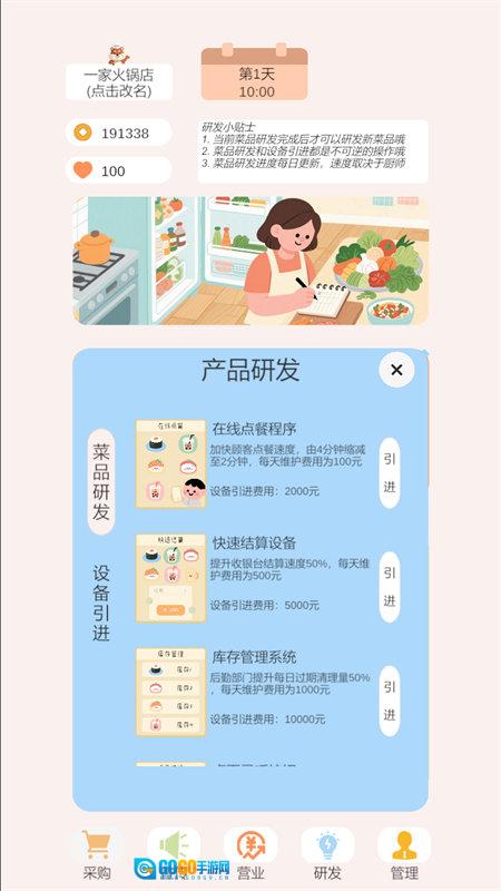 2、在菜品设计上,游戏为玩家准备了丰富的基础配方,方便他们自由搭配与创新。玩家能够打造专属锅底或是特色菜品,从而吸引各类顾客,提高回头客的比例。