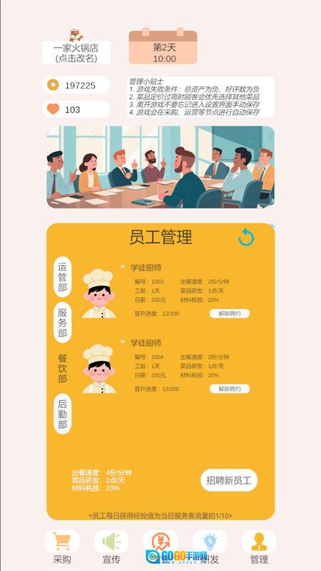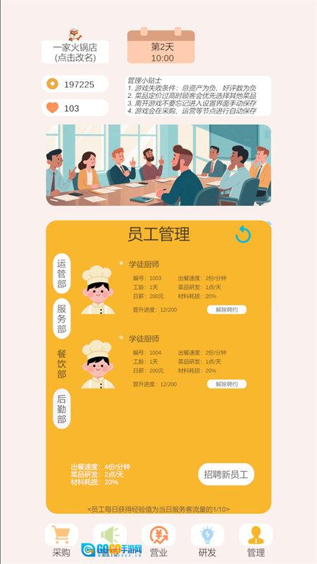 3、服务流程是游戏里不可或缺的关键环节。玩家要对员工进行分工安排,涵盖前台接待、后厨制作以及清洁维护等不同岗位,同时还得处理员工培训、排班和满意度方面的事宜,防止因为服务质量下滑而导致客源减少。
