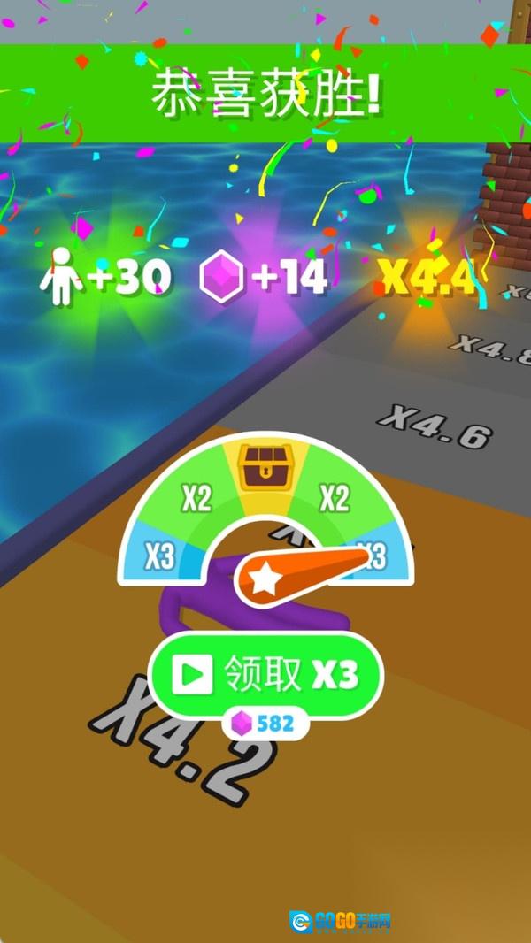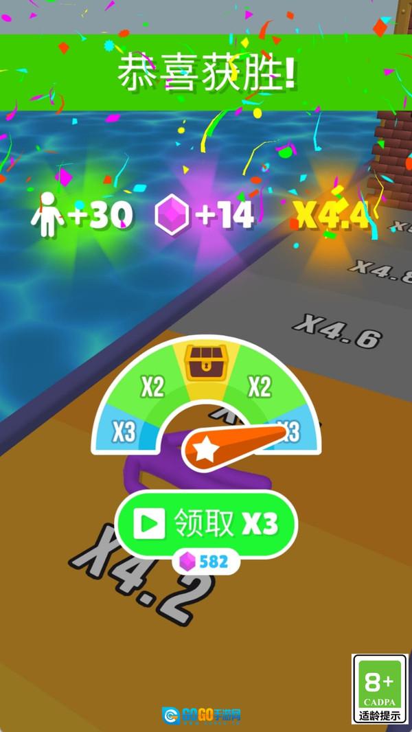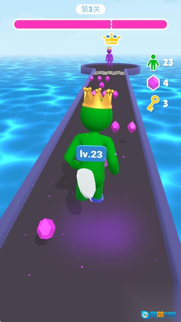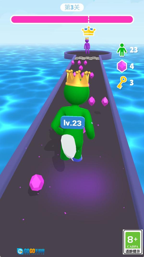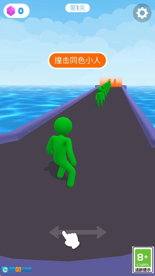 在跑酷玩法里,玩家得操控巨人避开障碍物,收集和自己颜色一致的小人,以此让巨人完成升级。