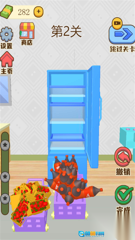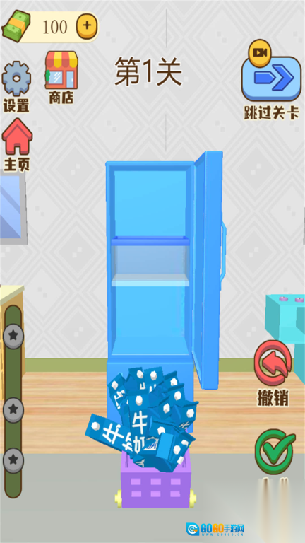 2、通过完成每一关的收纳任务来获取金币,之后可以前往商店解锁各类新的外观道具,用这些道具来装饰你的冰箱。