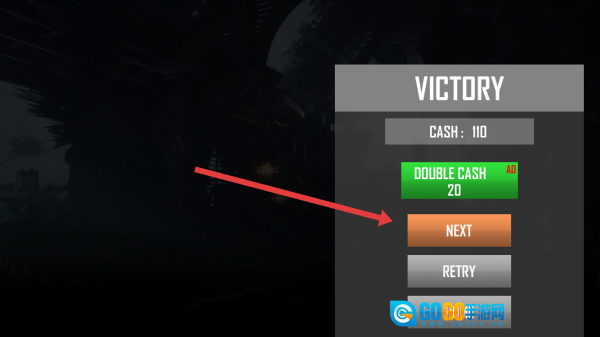 3、在胜利界面里,点击橙色的NEXT按钮,就能领取110现金奖励,接着挑战后面的关卡,以此积累资源和游戏成就。