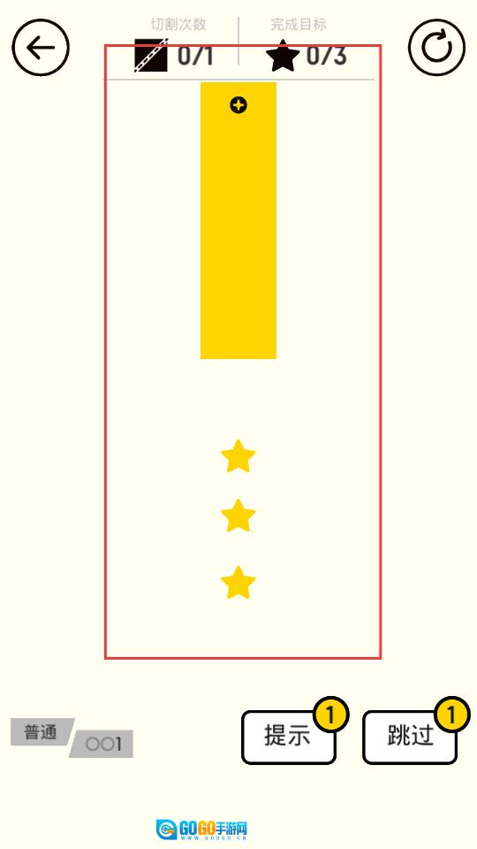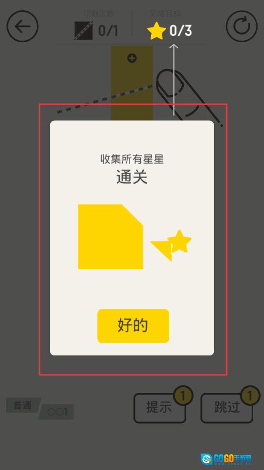 1、点击弹窗中的“好的”进入关卡,根据星星的位置规划切割路径,然后用手指在屏幕上滑动来切割黄色方块。