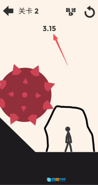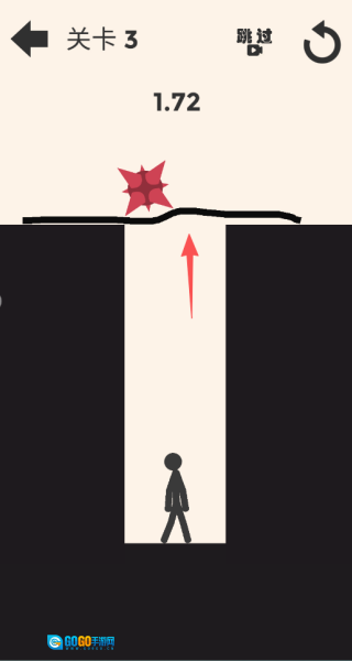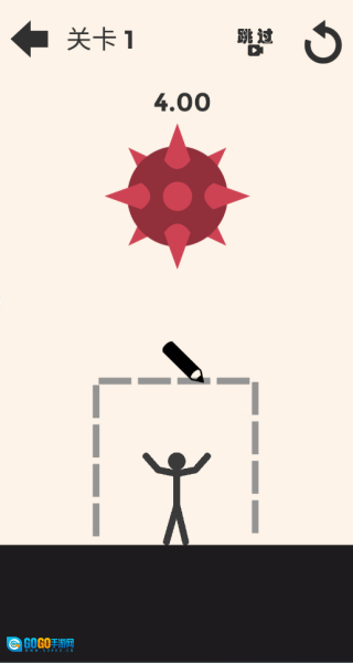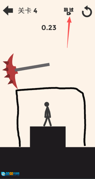 4、迅速画出一个能把火柴人及其所处平台完整包围起来的封闭区域,以此抵挡左侧带刺巨斧的袭击;要是操作没跟上,也可以点击“跳过”按钮来快速通过这一关。