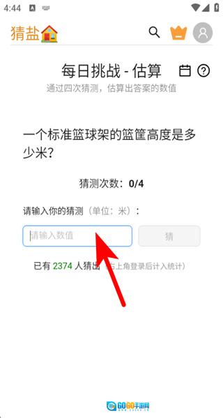 1、在每日挑战的估算环节里,点击输入框后,输入你猜测的标准篮球架篮筐高度的数值,接着点击提交按钮,总共拥有4次猜测机会。