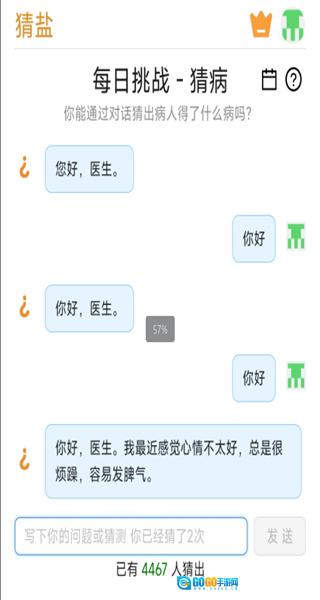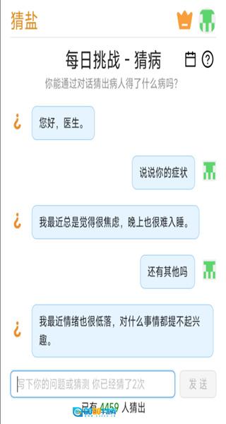 猜病是一款模拟真实问诊场景的休闲猜谜游戏,玩家将扮演医生,通过线上问诊与病人展开对话,自主输入问题来追问病情细节。根据病人的回答提取关键线索后,判断出具体病症并输入答案即可得分。这款游戏玩法简单,代入感却很强,能让你充分体验问诊推理的独特乐趣。